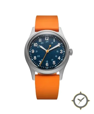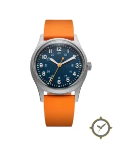 Eine Field-Uhr mit einem 37.5mm Gehäuse im Vintage-Stil gefertigt aus Edelstahl mit einem Zifferblatt in blau und einer besonderen "grained/textured finish"-Oberfläche.