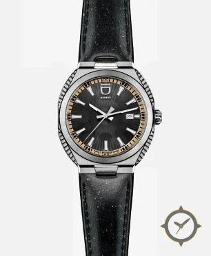 Eine Luxus-Uhr mit einem markanten 47mm Auftritt am Handgelenk, gefertigt aus Edelstahl mit einem Zifferblatt in schwarz und einer besonderen "sunburst"-Oberfläche.