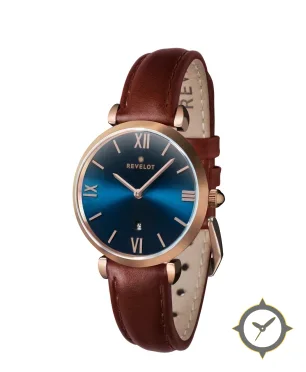 Eine Dress-Uhr mit einem 31mm Gehäuse im Vintage-Stil gefertigt aus Gold mit einem Zifferblatt in blau und einer besonderen "sunburst"-Oberfläche.