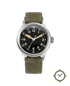 Eine Field-Uhr mit einem 32.5mm Gehäuse im Vintage-Stil gefertigt aus Edelstahl mit einem Zifferblatt in schwarz und einer besonderen "glossy"-Oberfläche.