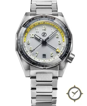 Eine GMT-Uhr mit einem 34mm Gehäuse im Vintage-Stil gefertigt aus Edelstahl mit einem Zifferblatt in silber und einer besonderen "matte"-Oberfläche, ideal für Weltenbummler dank der Weltzeit-Funktion.