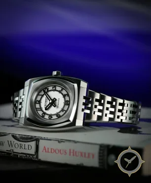 Eine Dress-Uhr mit einem 37mm Gehäuse im Vintage-Stil gefertigt aus Edelstahl mit einem Zifferblatt in weiß und einer besonderen "vertical brushed / guilloche center"-Oberfläche.