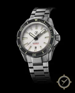 Eine Taucheruhr-Uhr mit einem markanten 46mm Auftritt am Handgelenk, gefertigt aus Edelstahl mit einem Zifferblatt in weiß und einer besonderen "grained/matte"-Oberfläche.