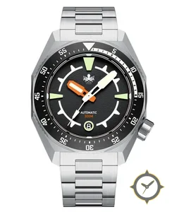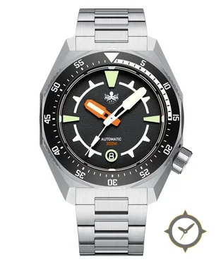 Eine Taucheruhr-Uhr mit einem 35.5mm Gehäuse im Vintage-Stil gefertigt aus Edelstahl mit einem Zifferblatt in schwarz und einer besonderen "textured/grain"-Oberfläche.