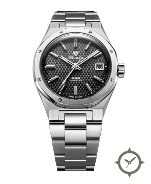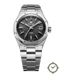 Eine Sport-Uhr mit einem 35.5mm Gehäuse im Vintage-Stil gefertigt aus Edelstahl mit einem Zifferblatt in schwarz und einer besonderen "carbon-fiber"-Oberfläche.
