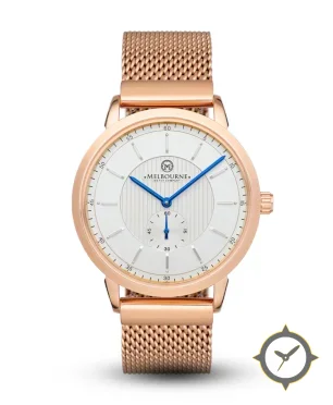 Eine Dress-Uhr mit einem markanten 44.5mm Auftritt am Handgelenk, gefertigt aus Gold mit einem Zifferblatt in weiß und einer besonderen "vertical striped center with smooth outer ring"-Oberfläche.