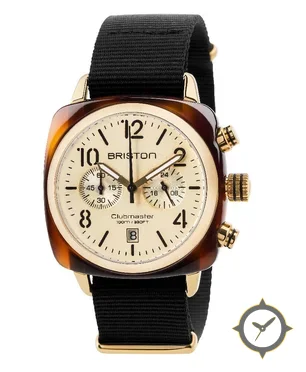Eine Chronograph-Uhr mit einem 34mm Gehäuse im Vintage-Stil gefertigt aus Edelstahl mit einem Zifferblatt in gold und einer besonderen "sunburst"-Oberfläche.