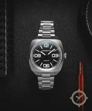 Eine Fahrer-Uhr mit einem 35mm Gehäuse im Vintage-Stil gefertigt aus Edelstahl mit einem Zifferblatt in schwarz und einer besonderen "matte"-Oberfläche.