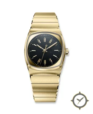 Eine Luxus-Uhr mit einem 25mm Gehäuse im Vintage-Stil gefertigt aus Gold mit einem Zifferblatt in schwarz und einer besonderen "glossy"-Oberfläche.