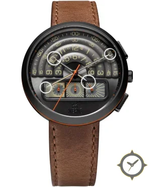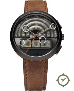 Eine Chronograph-Uhr mit einem markanten 42mm Auftritt am Handgelenk, gefertigt aus Edelstahl mit einem Zifferblatt in grau und einer besonderen "stepped concentric ridged rings with matte finish"-Oberfläche.