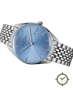 Eine Dress-Uhr mit einem markanten 43.5mm Auftritt am Handgelenk, gefertigt aus Edelstahl mit einem Zifferblatt in blau und einer besonderen "sunburst"-Oberfläche.