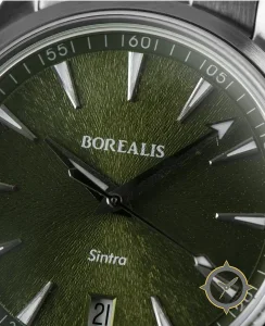 Eine Dress-Uhr mit einem 35.5mm Gehäuse im Vintage-Stil gefertigt aus Edelstahl mit einem Zifferblatt in grün und einer besonderen "sunburst radial (textured)"-Oberfläche.