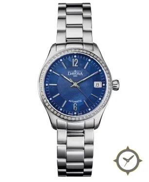 Eine Dress-Uhr mit einem 31.5mm Gehäuse im Vintage-Stil gefertigt aus Edelstahl mit einem Zifferblatt in blau und einer besonderen "mother-of-pearl with concentric guilloché / sunburst texture"-Oberfläche.