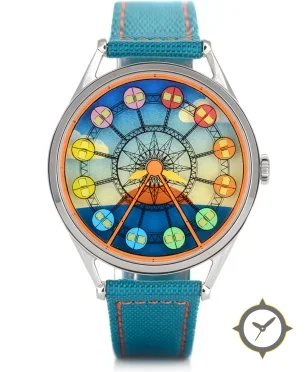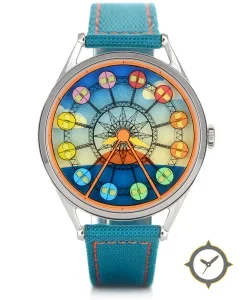Eine GMT-Uhr mit einem 30mm Gehäuse im Vintage-Stil gefertigt aus Edelstahl mit einem Zifferblatt in blau und einer besonderen "printed colorful illustration with gradient (smooth printed finish)"-Oberfläche und einer echten GMT-Funktion, mit der du eine zweite Zeitzone verfolgen kannst.