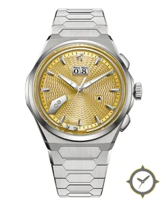 Eine Luxus-Uhr mit einem 37.5mm Gehäuse im Vintage-Stil gefertigt aus Edelstahl mit einem Zifferblatt in gold und einer besonderen "guilloché (spiral)"-Oberfläche.