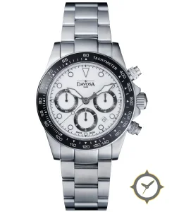 Eine Chronograph-Uhr mit einem 36.5mm Gehäuse im Vintage-Stil gefertigt aus Edelstahl mit einem Zifferblatt in weiß und einer besonderen "lacquer"-Oberfläche.