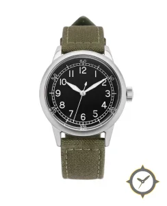 Eine Field-Uhr gefertigt aus Edelstahl mit einem Zifferblatt in schwarz und einer besonderen "matte"-Oberfläche.