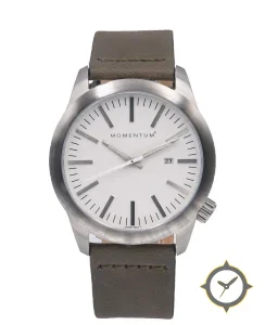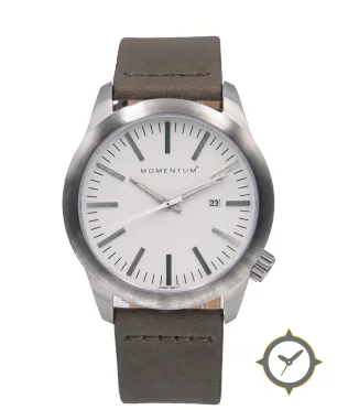 Eine Minimalistisch-Uhr mit einem markanten 48mm Auftritt am Handgelenk, gefertigt aus Edelstahl mit einem Zifferblatt in weiß und einer besonderen "matte"-Oberfläche.