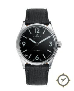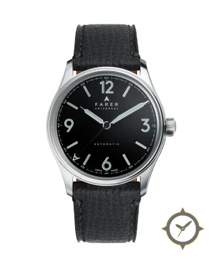 Eine Dress-Uhr mit einem 36mm Gehäuse im Vintage-Stil gefertigt aus Edelstahl mit einem Zifferblatt in schwarz und einer besonderen "glossy"-Oberfläche.