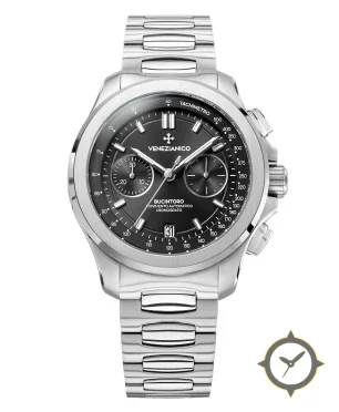 Eine Chronograph-Uhr mit einem 33mm Gehäuse im Vintage-Stil gefertigt aus Edelstahl mit einem Zifferblatt in schwarz und einer besonderen "sunburst brushed metallic"-Oberfläche.
