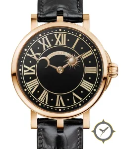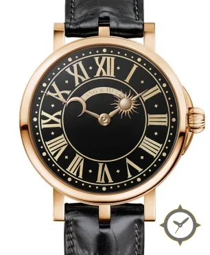Eine Dress-Uhr mit einem 33.5mm Gehäuse im Vintage-Stil gefertigt aus Gold mit einem Zifferblatt in schwarz und einer besonderen "lacquer"-Oberfläche und einer wunderschönen Mondphasenanzeige.
