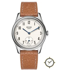 Eine Dress-Uhr mit einem 37mm Gehäuse im Vintage-Stil gefertigt aus Edelstahl mit einem Zifferblatt in weiß und einer besonderen "matte"-Oberfläche.