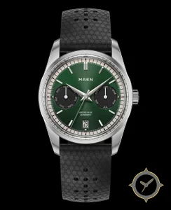 Eine Dress-Uhr mit einem 29mm Gehäuse im Vintage-Stil gefertigt aus Edelstahl mit einem Zifferblatt in grün und einer besonderen "sunburst"-Oberfläche.