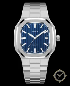 Eine Luxus-Uhr mit einem 32mm Gehäuse im Vintage-Stil gefertigt aus Edelstahl mit einem Zifferblatt in blau und einer besonderen "vertical ribbed / guilloché"-Oberfläche.