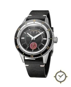 Eine Taucheruhr-Uhr mit einem markanten 44.5mm Auftritt am Handgelenk, gefertigt aus Edelstahl mit einem Zifferblatt in schwarz und einer besonderen "vertical brushed"-Oberfläche und einer praktischen Gangreserveanzeige.