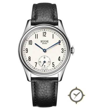 Eine Dress-Uhr mit einem 34mm Gehäuse im Vintage-Stil gefertigt aus Edelstahl mit einem Zifferblatt in weiß und einer besonderen "matte"-Oberfläche.