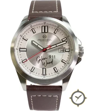 Eine Field-Uhr mit einem markanten 45mm Auftritt am Handgelenk, gefertigt aus Edelstahl mit einem Zifferblatt in silber und einer besonderen "sunburst"-Oberfläche.