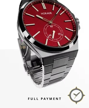 Eine Minimalistisch-Uhr mit einem 35mm Gehäuse im Vintage-Stil gefertigt aus Edelstahl mit einem Zifferblatt in rot und einer besonderen "grained"-Oberfläche.