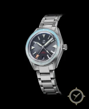 Eine GMT-Uhr mit einem 33mm Gehäuse im Vintage-Stil gefertigt aus Edelstahl mit einem Zifferblatt in grau und einer besonderen "sunburst"-Oberfläche und einer echten GMT-Funktion, mit der du eine zweite Zeitzone verfolgen kannst.