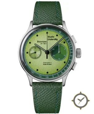 Eine Chronograph-Uhr mit einem 33.5mm Gehäuse im Vintage-Stil gefertigt aus Edelstahl mit einem Zifferblatt in grün und einer besonderen "granular / grained textured finish"-Oberfläche.