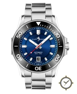 Eine Taucheruhr-Uhr mit einem 35.5mm Gehäuse im Vintage-Stil gefertigt aus Edelstahl mit einem Zifferblatt in blau und einer besonderen "radial sunburst finish"-Oberfläche.