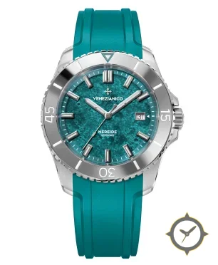 Eine Taucheruhr-Uhr mit einem markanten 42.5mm Auftritt am Handgelenk, gefertigt aus Edelstahl mit einem Zifferblatt in türkis und einer besonderen "verdigris stone / hammered texture"-Oberfläche.
