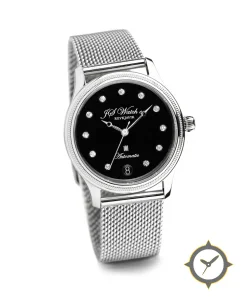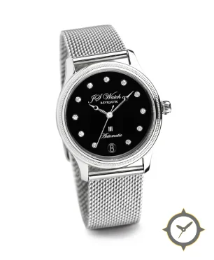 Eine Dress-Uhr mit einem 34.5mm Gehäuse im Vintage-Stil gefertigt aus Edelstahl mit einem Zifferblatt in schwarz und einer besonderen "glossy"-Oberfläche.