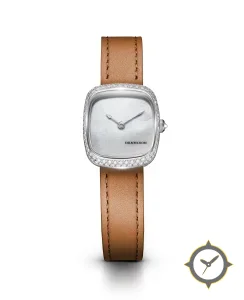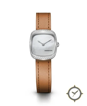 Eine Dress-Uhr mit einem 22.5mm Gehäuse im Vintage-Stil gefertigt aus Edelstahl mit einem Zifferblatt in weiß und einer besonderen "mother-of-pearl"-Oberfläche.