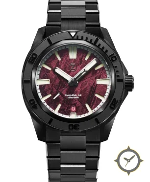 Eine Taucheruhr-Uhr mit einem markanten 42.5mm Auftritt am Handgelenk, gefertigt aus Edelstahl mit einem Zifferblatt in rot und einer besonderen "meteorite-like textured finish"-Oberfläche.