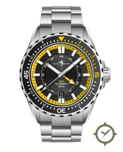 Eine GMT-Uhr mit einem vielseitigen 40mm Gehäuse, das an fast jedes Handgelenk passt, gefertigt aus Edelstahl mit einem Zifferblatt in schwarz und einer besonderen "horizontal ribbed"-Oberfläche und einer echten GMT-Funktion, mit der du eine zweite Zeitzone verfolgen kannst.