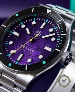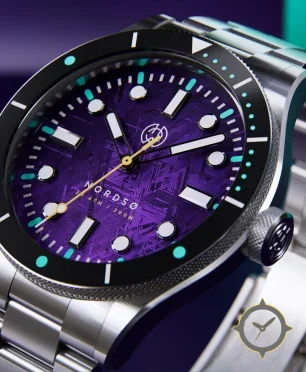 Eine Taucheruhr-Uhr mit einem markanten 46mm Auftritt am Handgelenk, gefertigt aus Edelstahl mit einem Zifferblatt in lila und einer besonderen "meteorite-style textured finish"-Oberfläche.