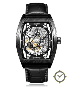 Eine Skelett-Uhr mit einem markanten 44.5mm Auftritt am Handgelenk, gefertigt aus Edelstahl mit einem Zifferblatt in schwarz und einer besonderen "skeleton/open-work"-Oberfläche.