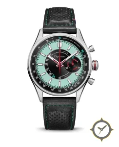 Eine Racing-Uhr mit einem markanten 46mm Auftritt am Handgelenk, gefertigt aus Edelstahl mit einem Zifferblatt in türkis und einer besonderen "matte outer ring with sunburst center"-Oberfläche.