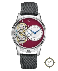 Eine Skelett-Uhr mit einem vielseitigen 39.5mm Gehäuse, das an fast jedes Handgelenk passt, gefertigt aus Edelstahl mit einem Zifferblatt in karmesinrot und einer besonderen "horizontally brushed"-Oberfläche.