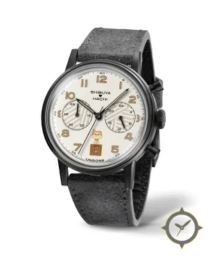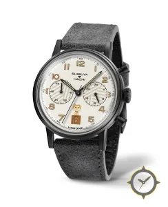 Eine Vintage-Uhr mit einem markanten 47.5mm Auftritt am Handgelenk, gefertigt aus Edelstahl mit einem Zifferblatt in weiß und einer besonderen "matte lacquer"-Oberfläche.