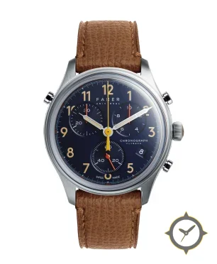 Eine Chronograph-Uhr mit einem vielseitigen 40.5mm Gehäuse, das an fast jedes Handgelenk passt, gefertigt aus Edelstahl mit einem Zifferblatt in marineblau und einer besonderen "sunburst"-Oberfläche.