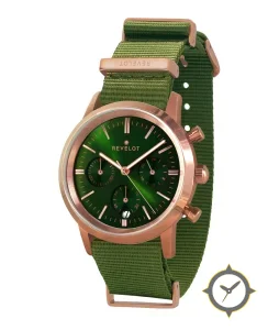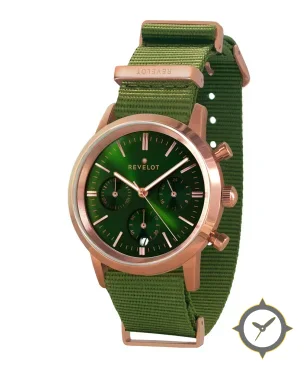 Eine Chronograph-Uhr mit einem markanten 42.5mm Auftritt am Handgelenk, gefertigt aus Gold mit einem Zifferblatt in grün und einer besonderen "sunburst (radial gradient)"-Oberfläche.