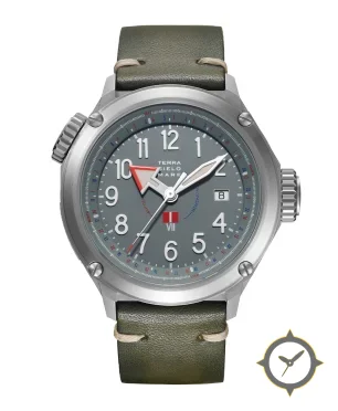 Eine Pilot-Uhr mit einem markanten 47.5mm Auftritt am Handgelenk, gefertigt aus Edelstahl mit einem Zifferblatt in grau und einer besonderen "matte"-Oberfläche.