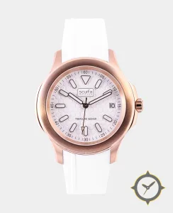 Eine Taucheruhr-Uhr mit einem markanten 46mm Auftritt am Handgelenk, gefertigt aus Edelstahl mit einem Zifferblatt in weiß und einer besonderen "textured honeycomb"-Oberfläche.