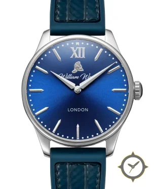 Eine Dress-Uhr mit einem markanten 43mm Auftritt am Handgelenk, gefertigt aus Edelstahl mit einem Zifferblatt in blau und einer besonderen "sunburst"-Oberfläche.